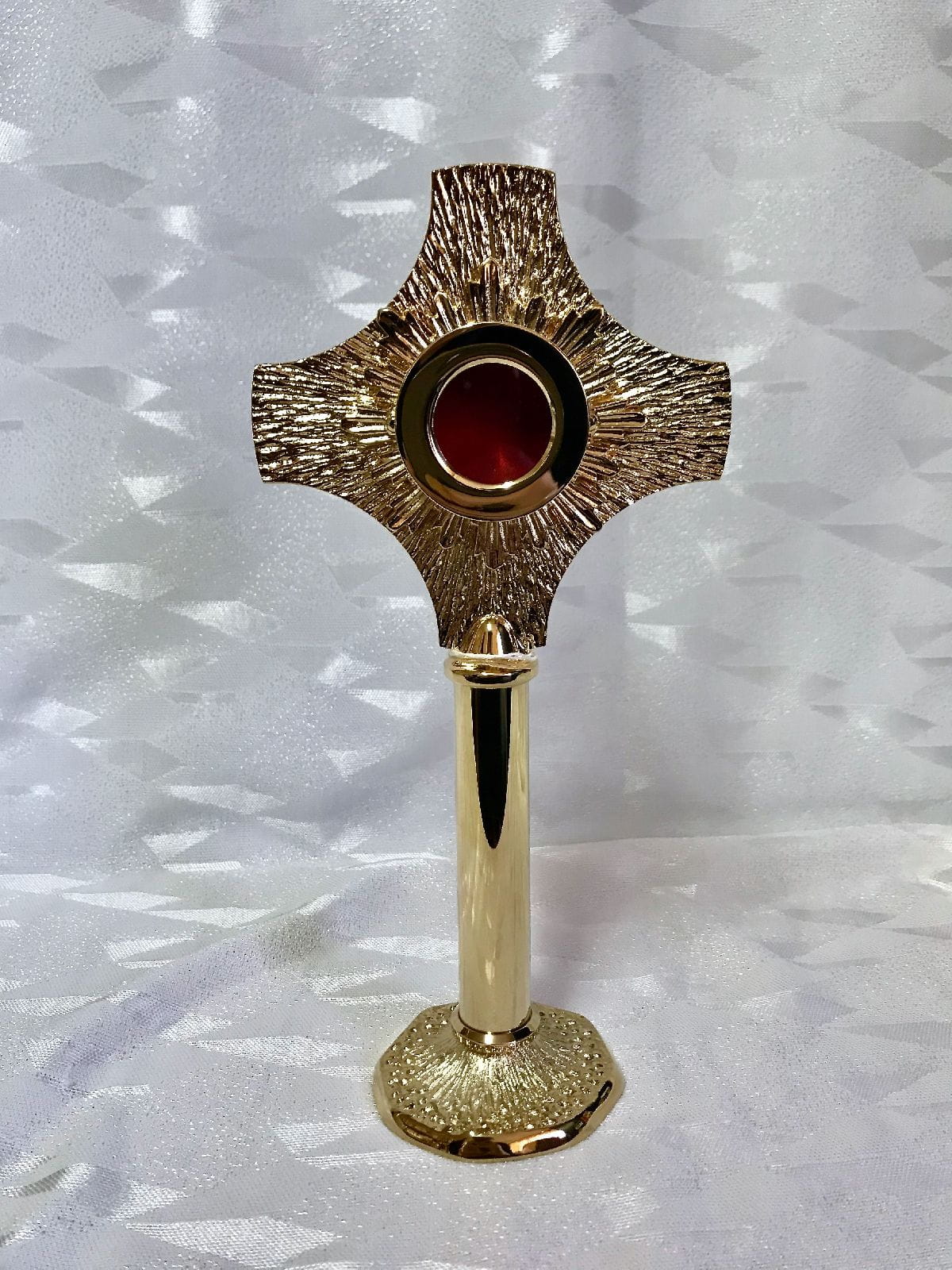 Relikwiarz h= 24 cm, luna Ø 4,6 cm, naczynie liturgiczne mosiężne, pozłacane, elementy odlewane.