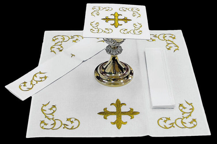 Bielizna kielichowa haftowana składa się z haftowanego korporału, palki, puryfikaterza oraz niehaftowanego ręcznika.