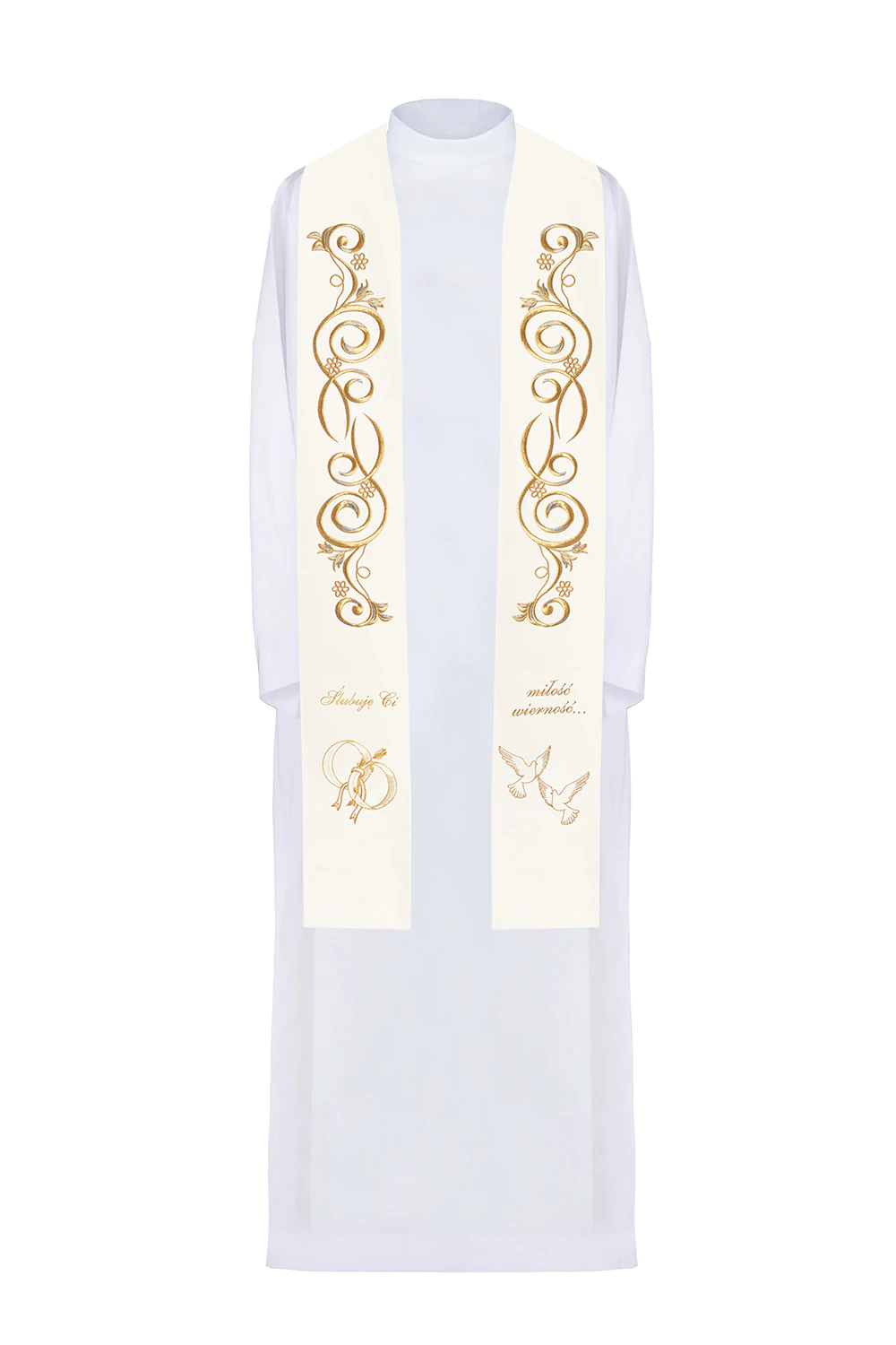 Stuła jednostronna wykonana z wysokiej jakości tkaniny gładkiej, zdobiona bogatym haftem z symbolem Ślubnym oraz napisem "Ślubuję Ci miłość wierność".