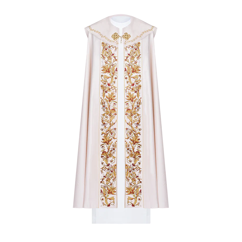 Kapa wykonana z wysokiej jakości tkaniny gładkiej satynowej. Zdobiona haftem wypukłym. Kaptur z symbolem IHS.