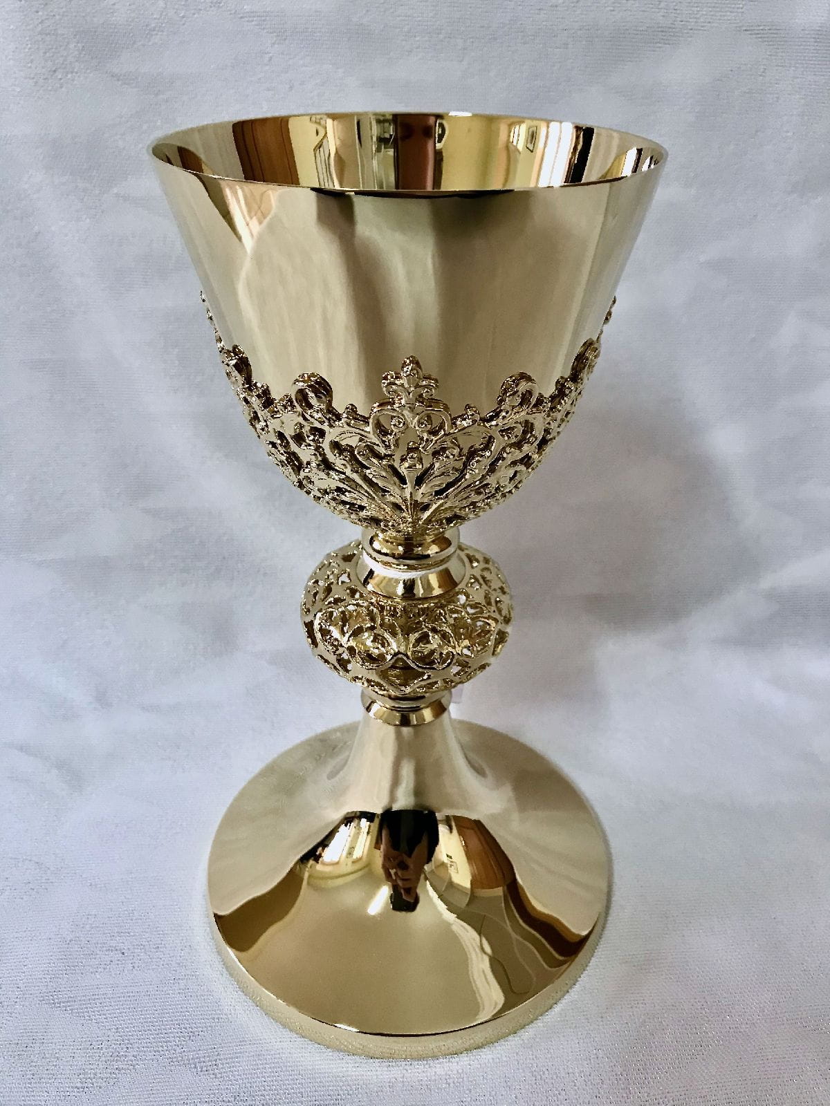 Kielich mszalny h= 21 cm, Ø 10 cm, naczynie liturgiczne mosiężne, pozłacane, elementy odlewane.