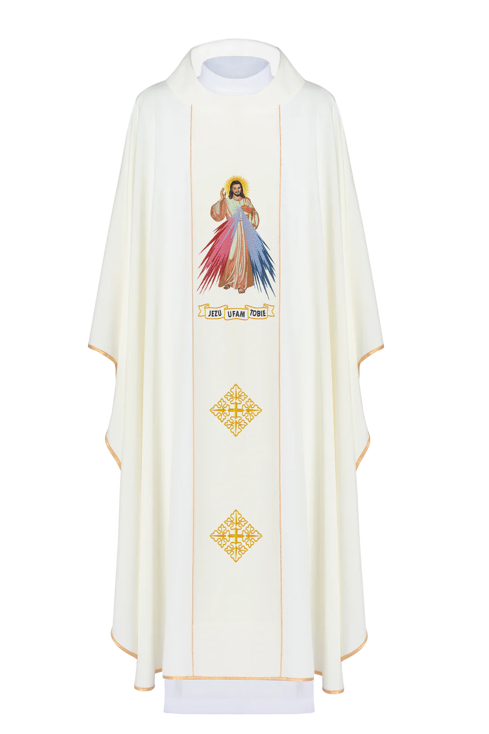 Ornat wykonany z wysokiej jakości tkaniny gładkiej, zdobiony pasem z haftowanym wizerunkiem Miłosierdzia Bożego z napisem "Jezu ufam tobie" Całość wykończona złoto-satynową lamówką.