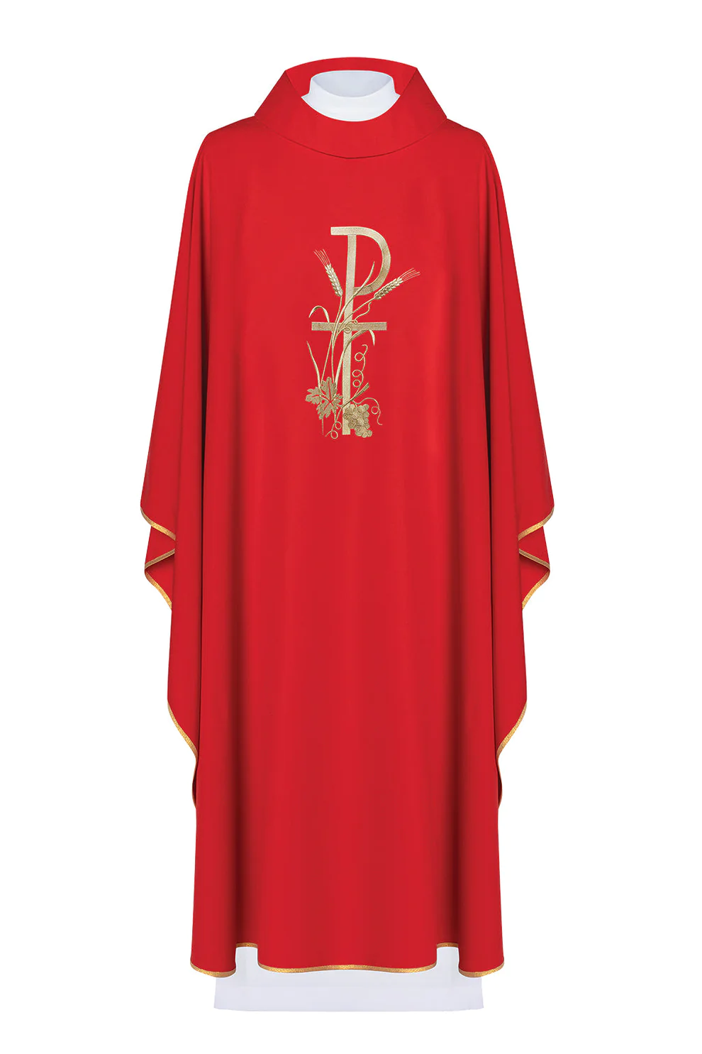 Ornat wykonany z wysokiej jakości tkaniny gładkiej, zdobiony bogatym haftem z symbolem Krzyża. Całość wykończona złoto-satynową lamówką. Dostępny we wszystkich kolorach liturgicznych.