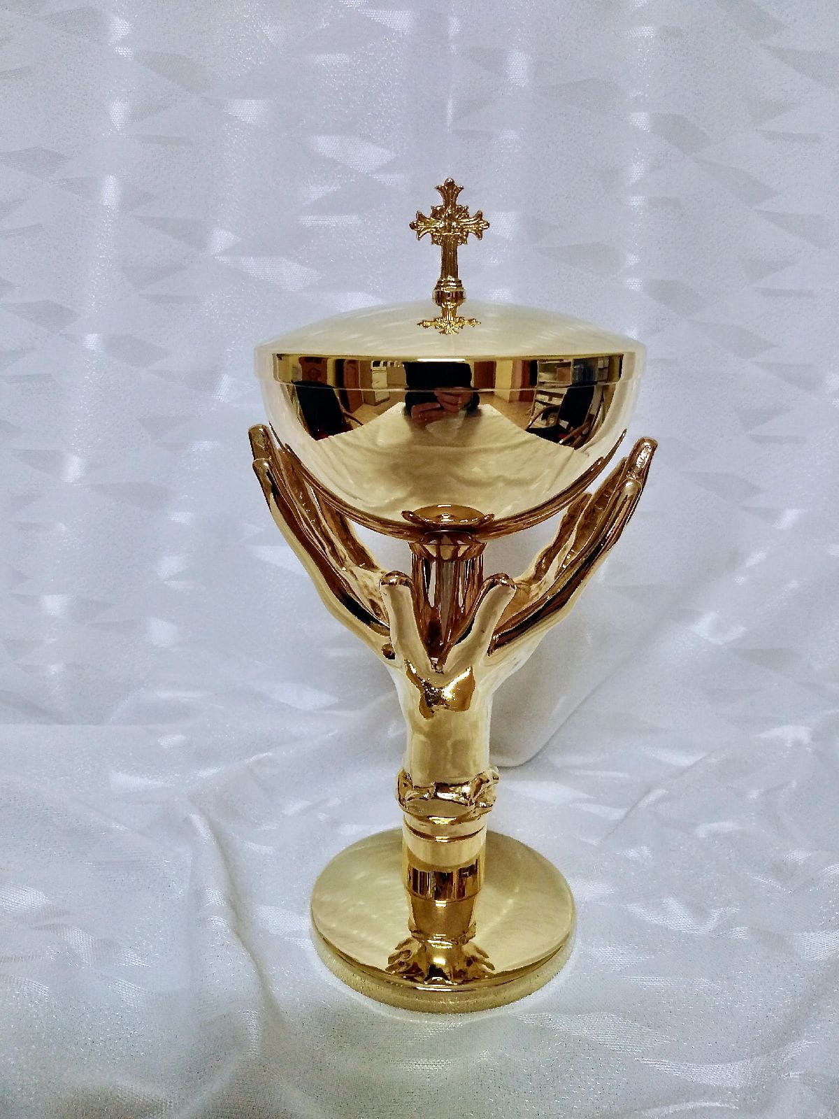 Puszka na komunikanty dłonie Ø 12 cm, h= 26 cm, naczynie liturgiczne mosiężne, pozłacane, elementy odlewane.