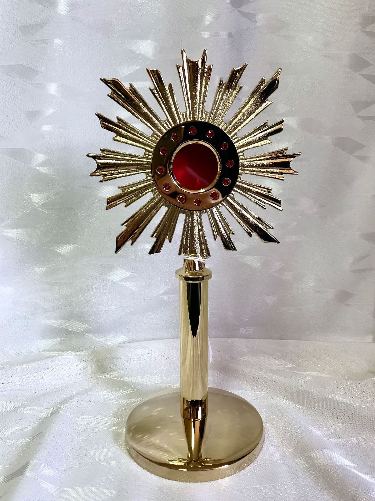Relikwiarz h= 26 cm, naczynie liturgiczne mosiężne, pozłacane, elementy odlewane, czerwone kamienie Svarovskiego.