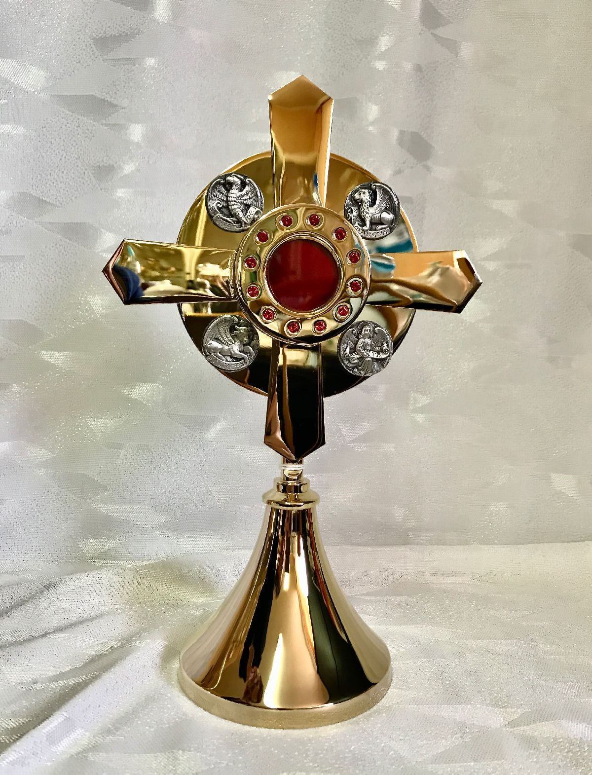 Relikwiarz h= 25 cm, naczynie liturgiczne mosiężne, pozłacane, elementy odlewane, czerwone kamienie Svarovskiego.