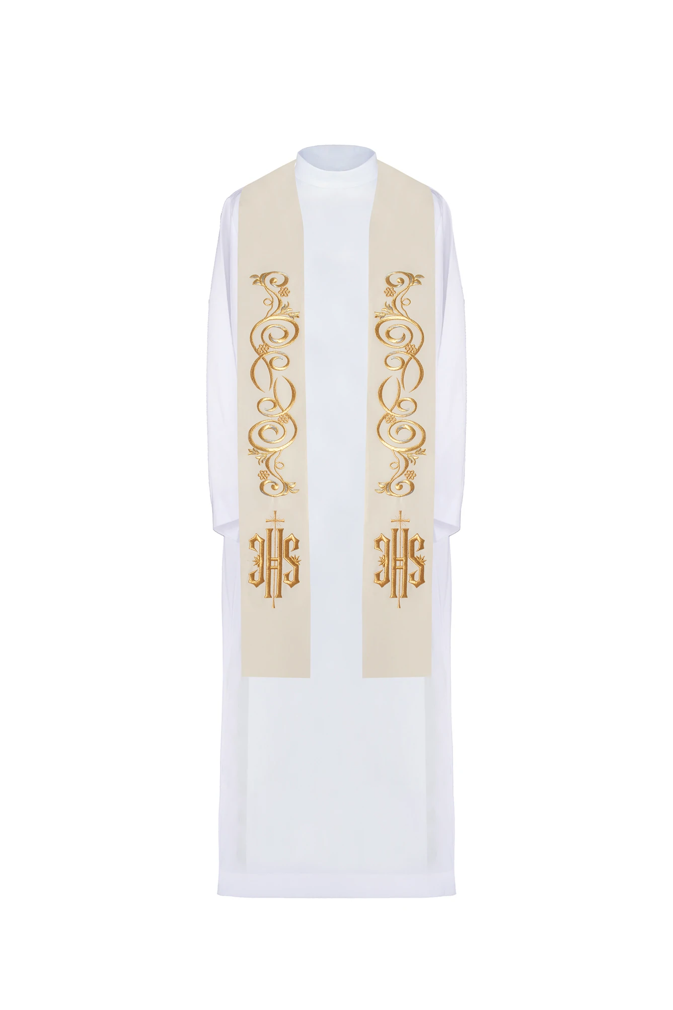 Stuła jednostronna wykonana z wysokiej jakości tkaniny gładkiej, zdobiona haftem z symbolem IHS.
