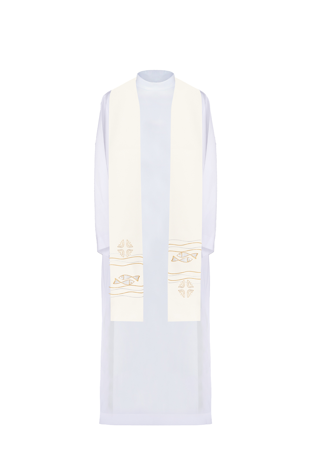 Stuła jednostronna wykonana z wysokiej jakości tkaniny gładkiej, zdobiona bogatym haftem z symbolem ryby.