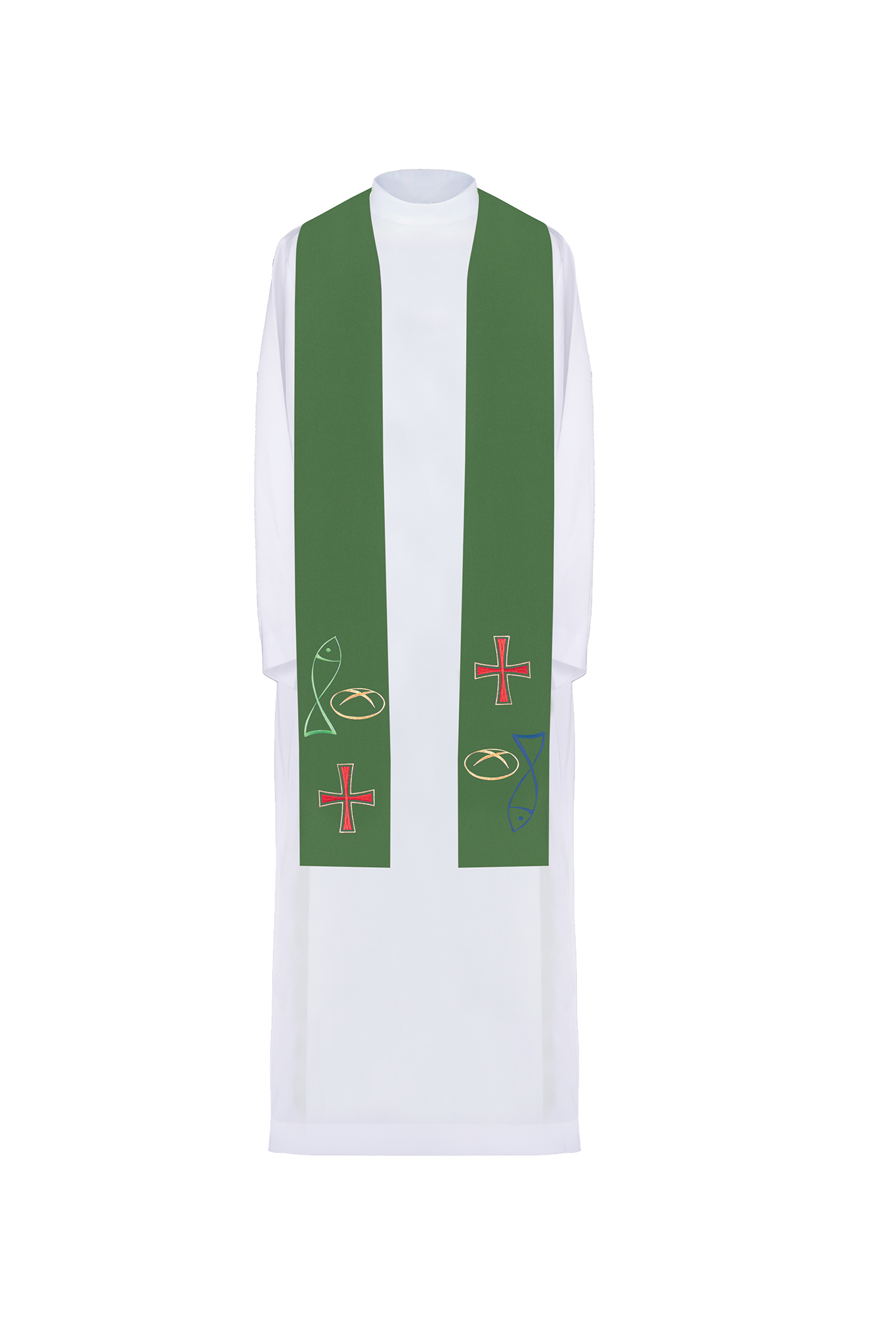 Stuła jednostronna wykonana z wysokiej jakości tkaniny gładkiej, zdobiona bogatym haftem z symbolem Ryby i Chleba.