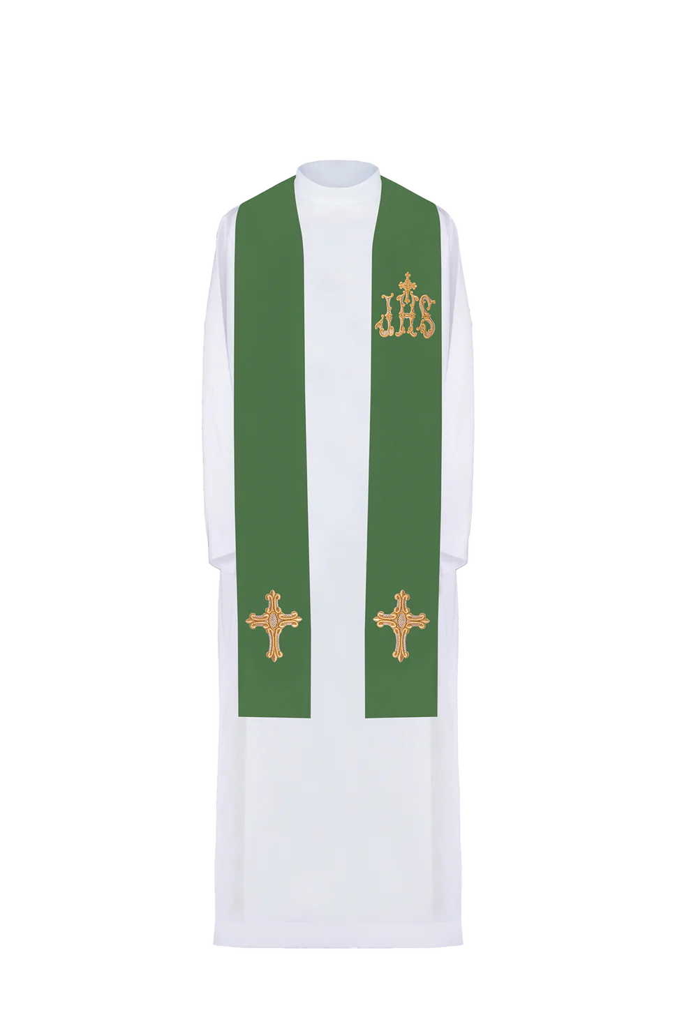 Stuła kapłańska zielona haftowana. Krzyż i IHS Zielona