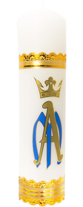 Świeca ołtarzowa z naklejką maryjną, wysokość 23 cm, średnica 6 cm.
